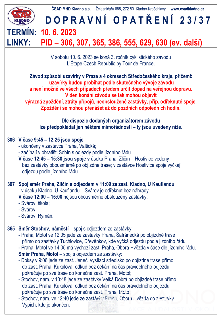 V sobotu 10.6.2023 se koná 3. ročník cyklistického závodu L’Etape Czech Republic by Tour de France. Závod se dotkne dopravy po trase závodu a provozu linek PID 306, 307, 365, 386, 555, 629, 630.