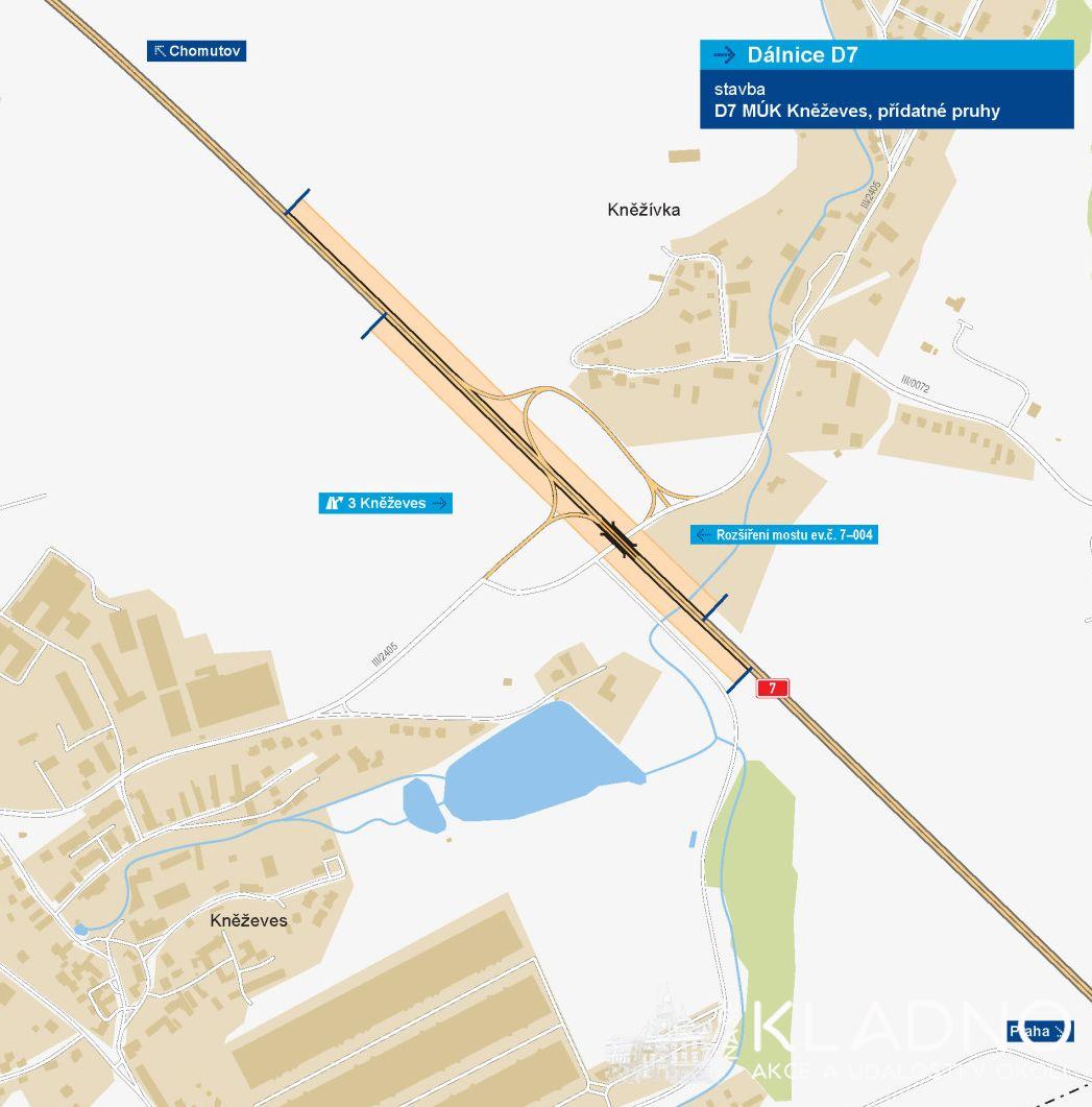 Od března 2023 přobíhá stavba připojovacího a odbočovacího pruhu na mimoúrovňové křižovatce Kněževes. Po dokončení stavby budou prodloužené pruhy splňovat platné normy. Dojde tak ke zvýšení bezpečnosti provozu na dálnici D7. Podívejte se na video jak stavba probíhá z května 2023.
