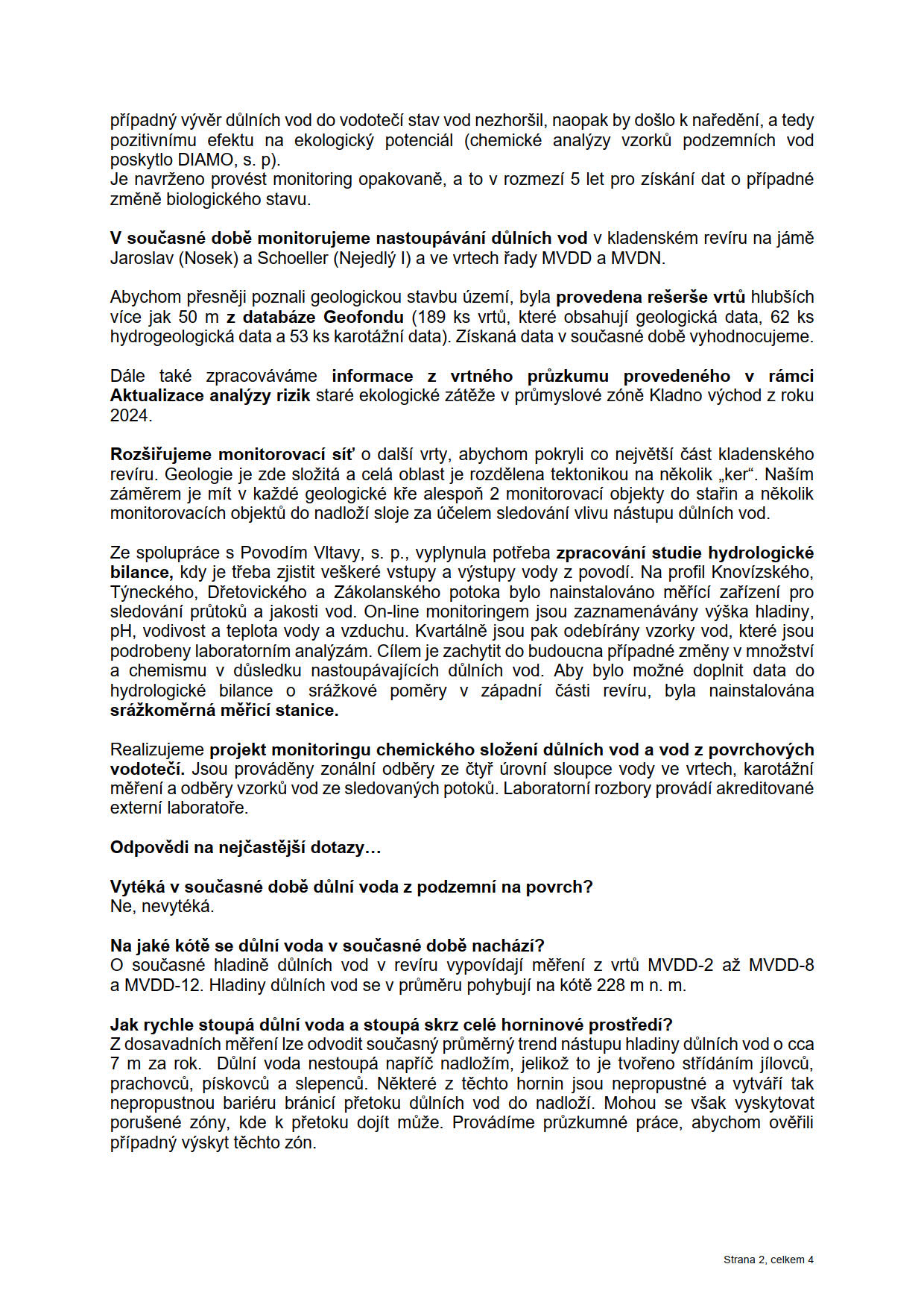 Ale v kostce: v kladenských důlních vodách NENÍ žádná časovaná bomba. Důlní vody jsou v prostoru a čase po mnoho let pečlivě monitorovány, výzkum probíhá v celém kladenském revíru, a to jak ve stařinách, tak v nadložních vrstvách. DIAMO sleduje hladiny důlních vod v několika vrtech, jejich kolísání v čase a chemické složení i v zonálních odběrech (z různých hloubek ve vrtu). Ve vodě jsou rozpuštěny látky, díky kterým by úprava na pitnou vodu byla nerentabilní – jedná se především o sírany, železo a mangan. Avšak nejsou to žádné toxické nebo radioaktivní látky, které by hrozily otrávit vodní zdroje. V době aktivní těžby, kdy se důlní vody kontinuálně odčerpávaly, voda se používala například k napouštění koupališť a k zálivce. Protože se voda nezdržovala ve vyrubaných prostorech, nedocházelo k louhování hornin a koncentrace prvků byly relativně nízké. Dnes jsou koncentrace vyšší, protože se voda přibližně dvacet let nečerpá a z horninového prostředí se prvky do vody louhují. V žádném vzorku ale nebyla prokázána přítomnost průmyslových kontaminací!