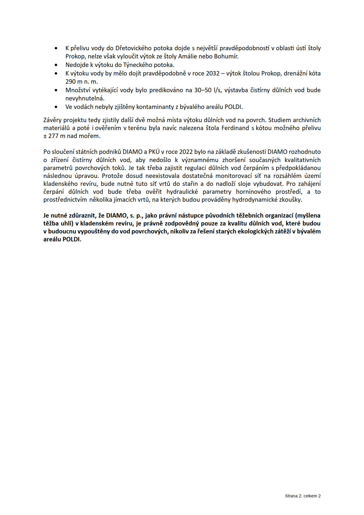 DIAMO aktuálně vytipovává vhodné místo pro výstavbu čistírny důlních vod, kde by se tyto vody čerpaly ještě před tím, než vůbec dosáhnou hladiny podzemních vod, vyčistí se a následně budou vypouštěny do vodoteče. Vzhledem ke stavu vodotečí na Kladensku (zejména Týnecký, Knovízský a Dřetovický potok) vypouštění a ředění vod v tocích paradoxně pomůže zlepšit jejich kvalitu a vodnost.