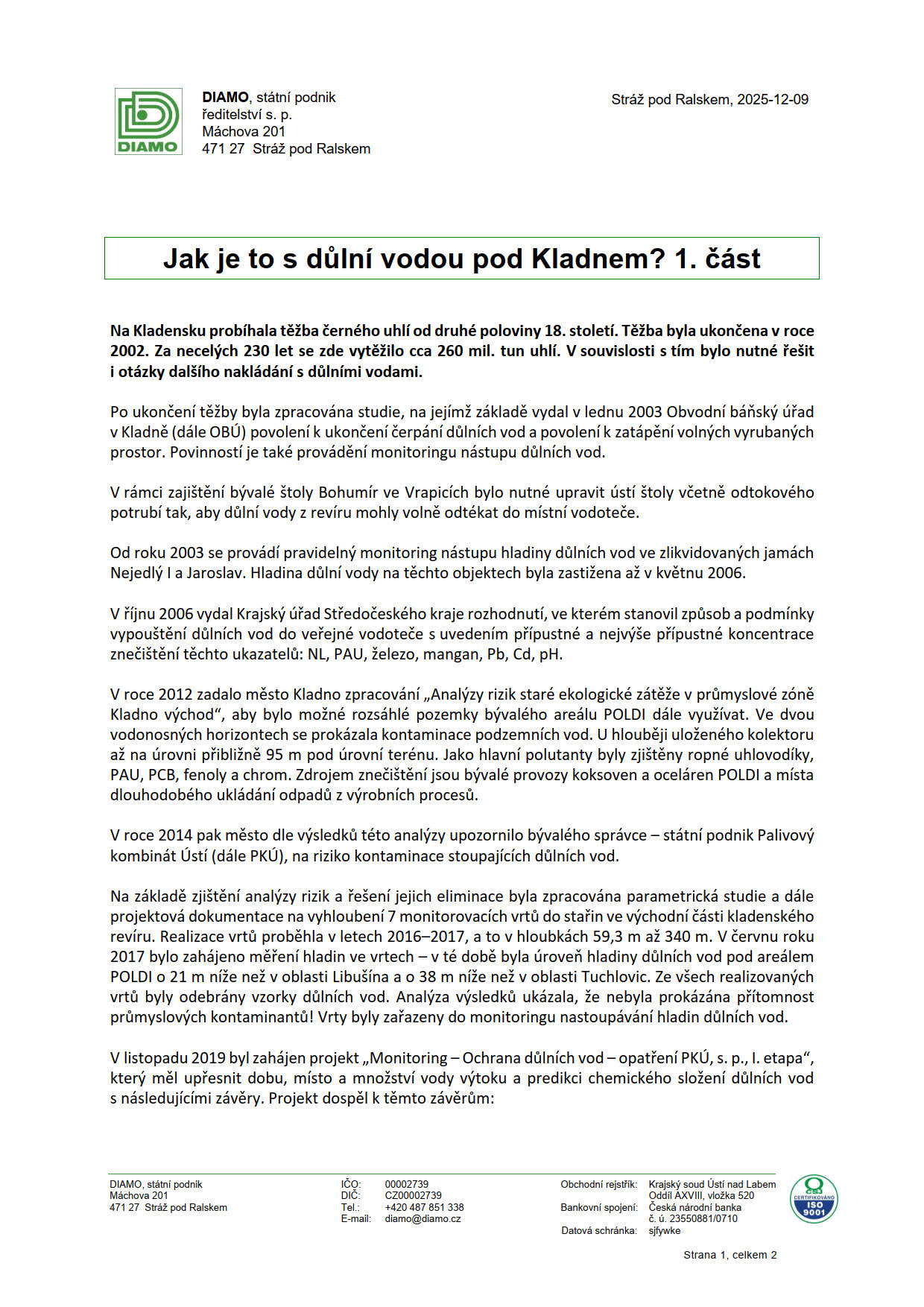 Pod vlivem těchto zpráv jsme si spolu s představiteli Odboru životního prostředí magistrátu města Kladna domluvili schůzku na DIAMu v Libušíně, abychom se dozvěděli, jak je to skutečně s důlními vodami. Pro ty, kdo nevědí – DIAMO je klíčová státní organizace zodpovědná za zahlazování následků hornické činnosti po těžbě uranu, rud a části uhlí v ČR. Hlavní činností je sanace, likvidace a rekultivace bývalých důlních areálů, ekologické škody a správa radioaktivních odpadů. Podnik spadá pod Ministerstvo průmyslu a obchodu. Problematika je poměrně složitá, podrobněji si můžete o probíhajících průzkumech přečíst na webu DIAMa a dokumenty dáváme i sem. (k dispozici níže)