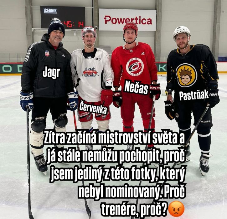 „V pátek začíná mistrovství světa a já stále nemůžu pochopit, proč jsem jediný z této fotky, který nebyl nominovaný. Proč, trenére, proč?“ ptá se Jágr s typickým humorem, který mu nikdy nechyběl.
