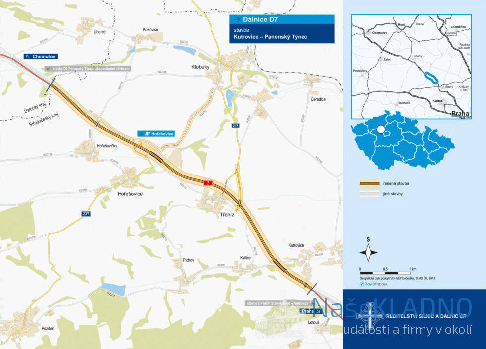 Ředitelství silnic a dálnic (ŘSD) vybralo zhotovitele nové části dálnice D7 na Kladensku, a to úsek mezi Kutrovicemi a Panenským Týncem. Postaví jej sdružení firem za více než 1,3 miliardy korun bez DPH. V provozu má být úsek do tří let. Archeologové zde dokončují průzkum a u konce je též majetkoprávní příprava. Stavba má začít ještě letos, informoval v tiskové zprávě Jiří Veselý z ŘSD.