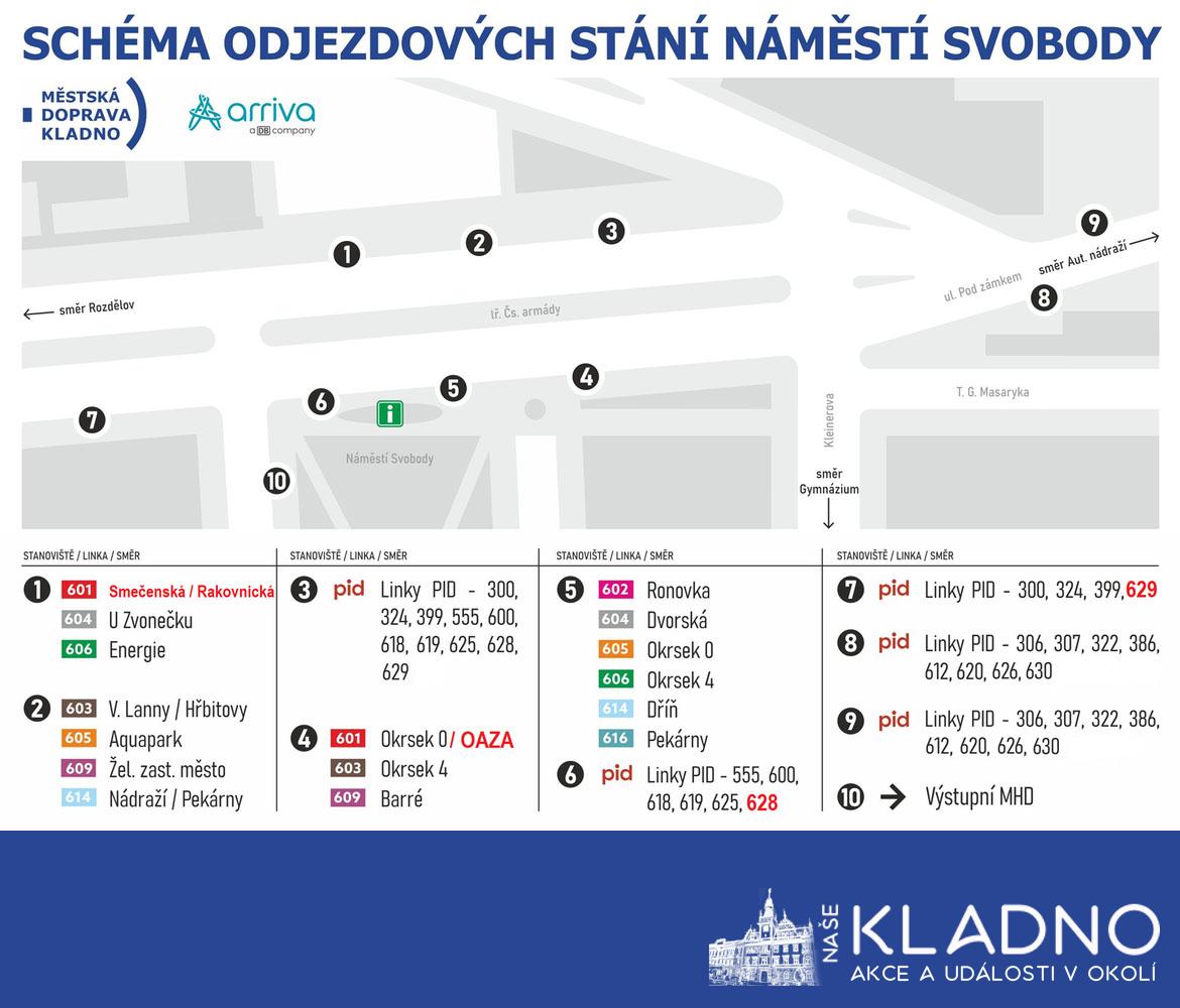 Od 1. září se změnila některá odjezdová stání autobusů na Náměstí Svobody v Kladně. Přinášíme přehledné schéma.