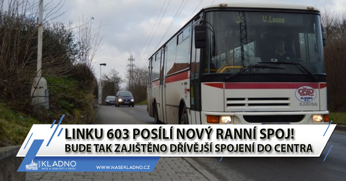 V pracovní dny bude od 2. května 2022 přidán nový ranní spoj na lince 603. Odjíždět bude v 4:18 hod. ze zastávky Kladno,V.Lanny, na náměstí Svobody bude v 4:27 hod. a do konečné na Okrsek 4 přijede v 4:39 hod. Cestující z oblasti sídliště V. Lanny a Ostrovce tak mají zajištěno dřívější spojení do centra a možnost přestupu na další městské i příměstské linky. Dosud první spoj vyjížděl v 4:41 hodin.