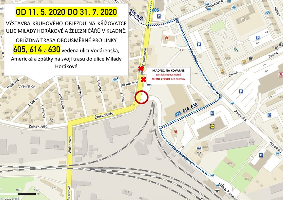 Zákaz průjezdu platí i pro autobusy MHD. Dočasně je zrušna zastávka MHD Na Kovárně. Objízdná trasa obousměrně pro linky 605, 614 a 630 vedena ulicí Vodárenská, Americká a zpátky na svoji trasu do ulice Milady Horákové