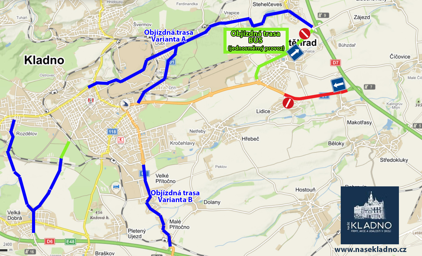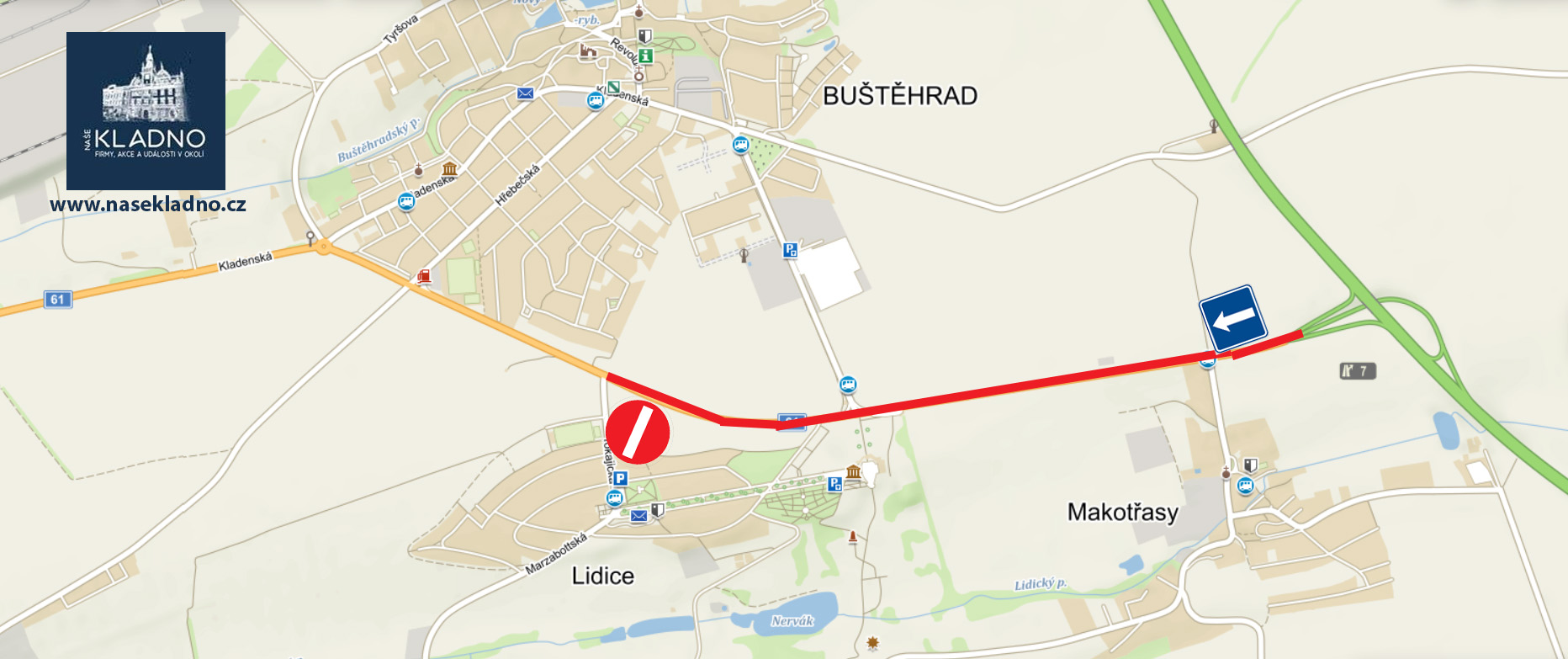 Pro autobusy je vedena objízdná trasa přes Buštěhrad, kdy ulice Tyršova je vedena jednosměrně směrem k D7.