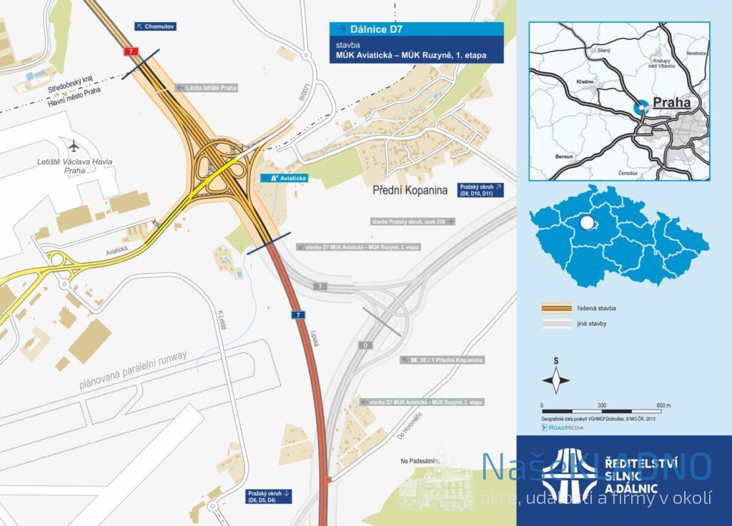 Ředitelství silnic a dálnic (ŘSD) oficiálně zahájilo dlouho očekávanou přestavbu mimoúrovňové křižovatky (MÚK) Aviatická na silnici I/7 v blízkosti Letiště Václava Havla. Projekt, jehož cena z výběrového řízení činí téměř 900 milionů korun bez DPH, je realizován ve spolupráci s Letištěm Václava Havla jako spoluinvestorem. Tato významná investice je zásadní pro zajištění bezpečnějšího a kapacitnějšího napojení letiště na dálnici D7 a Pražský okruh. Očekává se, že práce potrvají přibližně rok a půl.