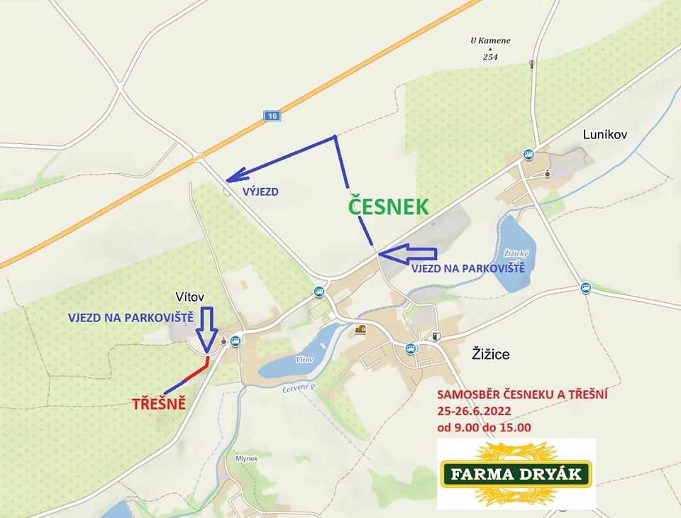 Mapa pro samosběr třešní a česneku ve Vítově, sobota a neděle 9-15 hodin. Směrovky budou od hlavní silnice.
