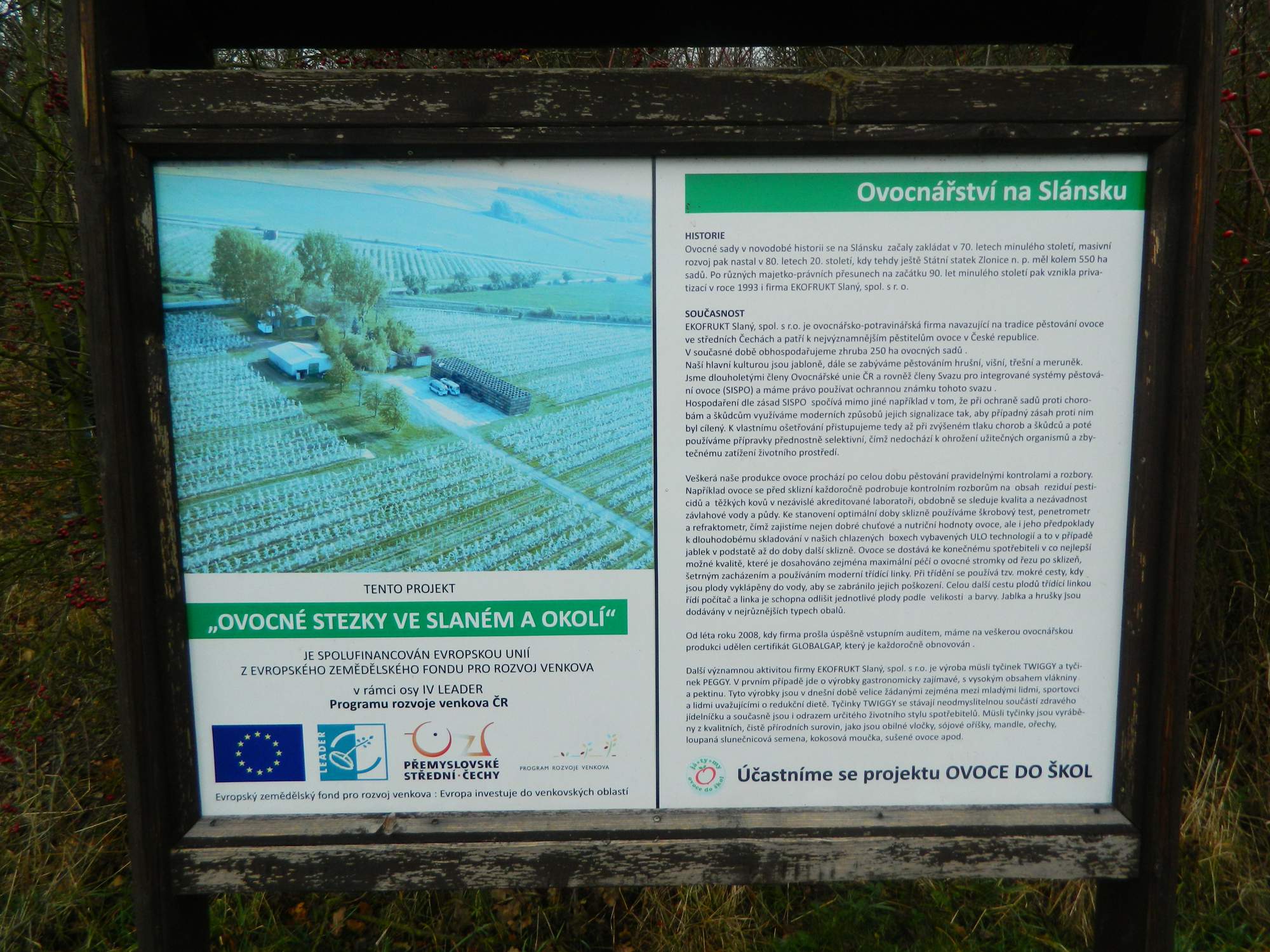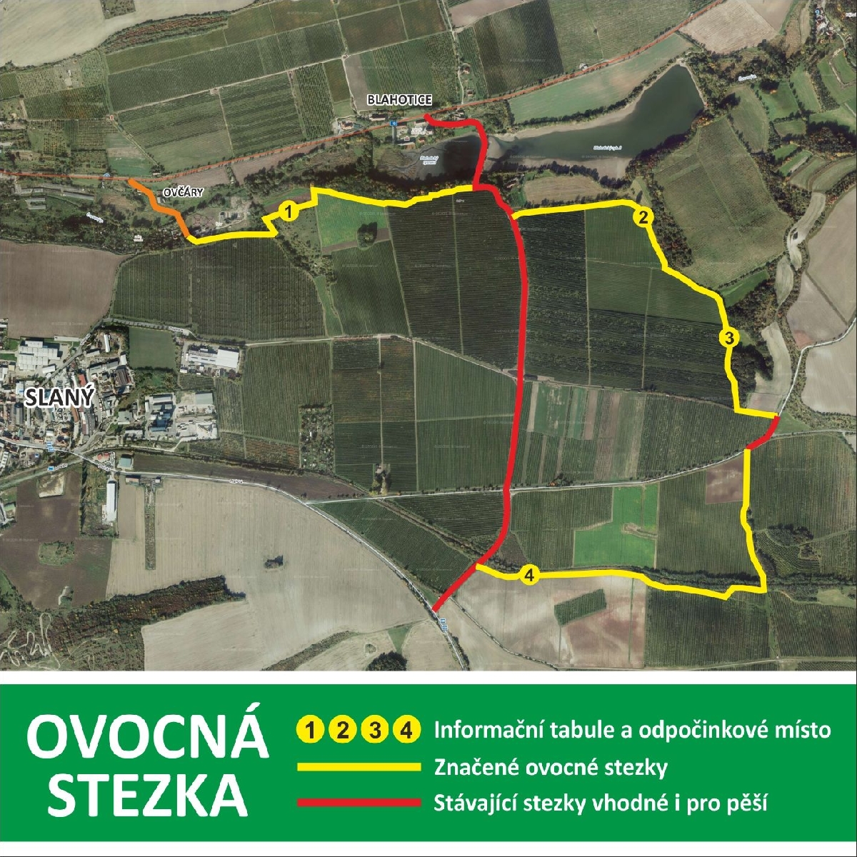 Pokud holdujete ovoci a krásným výhledům, oceníte procházku po ovocných sadech u Slaného. Ovocnářsko – potravinářská firma Ekofrukt Slaný přišla s nápadem vytvořit mezi jabloňovými sady Ovocnou stezku. Začátek je v Blahoticích a kolem sadů i mezi stromy můžete dojít až na Knovíz. Po návazných turistických trasách dojdete až k Drnovu a do Slaného nebo na druhou stranu ke kostelu sv. Václava v Ovčárech.