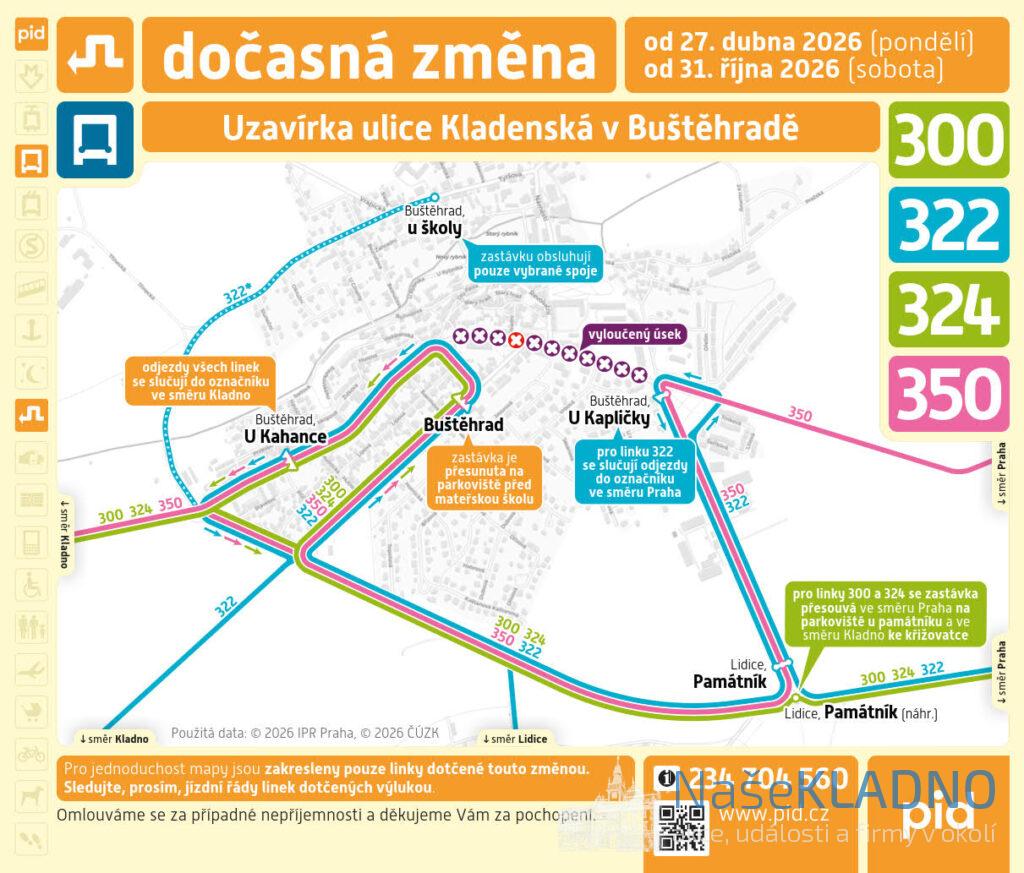 Revitalizace Kladenské ulice zásadně ovlivní také místní autobusovou dopravu. Autobusová zastávka „Buštěhrad“ (u Macíků) bude dočasně nahrazena novou náhradní zastávkou před mateřskou školou v Hřebečské ulici. Tato změna se týká linek 300, 324, 350 a 322, a platí pro oba směry.