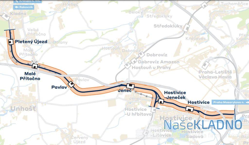 Úsek Praha-Ruzyně (mimo) – Kladno (mimo) je nejdelší ze série staveb, které mají propojit centrum Prahy, Kladno a Letiště Václava Havla. Projekt modernizace trati mezi stanicemi Praha-Ruzyně a Kladno zahrnuje především zdvoukolejnění a elektrizaci. Rychlost by se měla zvýšit v některých místech až na 145 km/h, modernizací projdou i stanice a zastávky. Stavba bude rozdělena na tři úseky: jako první bude na řadě stanice Jeneč, následovat bude část mezi Jenčí a Kladnem a nakonec úsek od Ruzyně do Jenče včetně Hostivice.