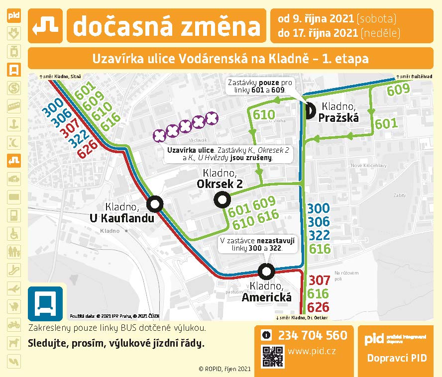 náhradní zastávky: U Kauflandu (obousměrně), Okrsek 2 (obousměrně),Pražská křiž. – směr Okrsek 4 (v Unhošťské ul před křižovatkou s Pražskou)